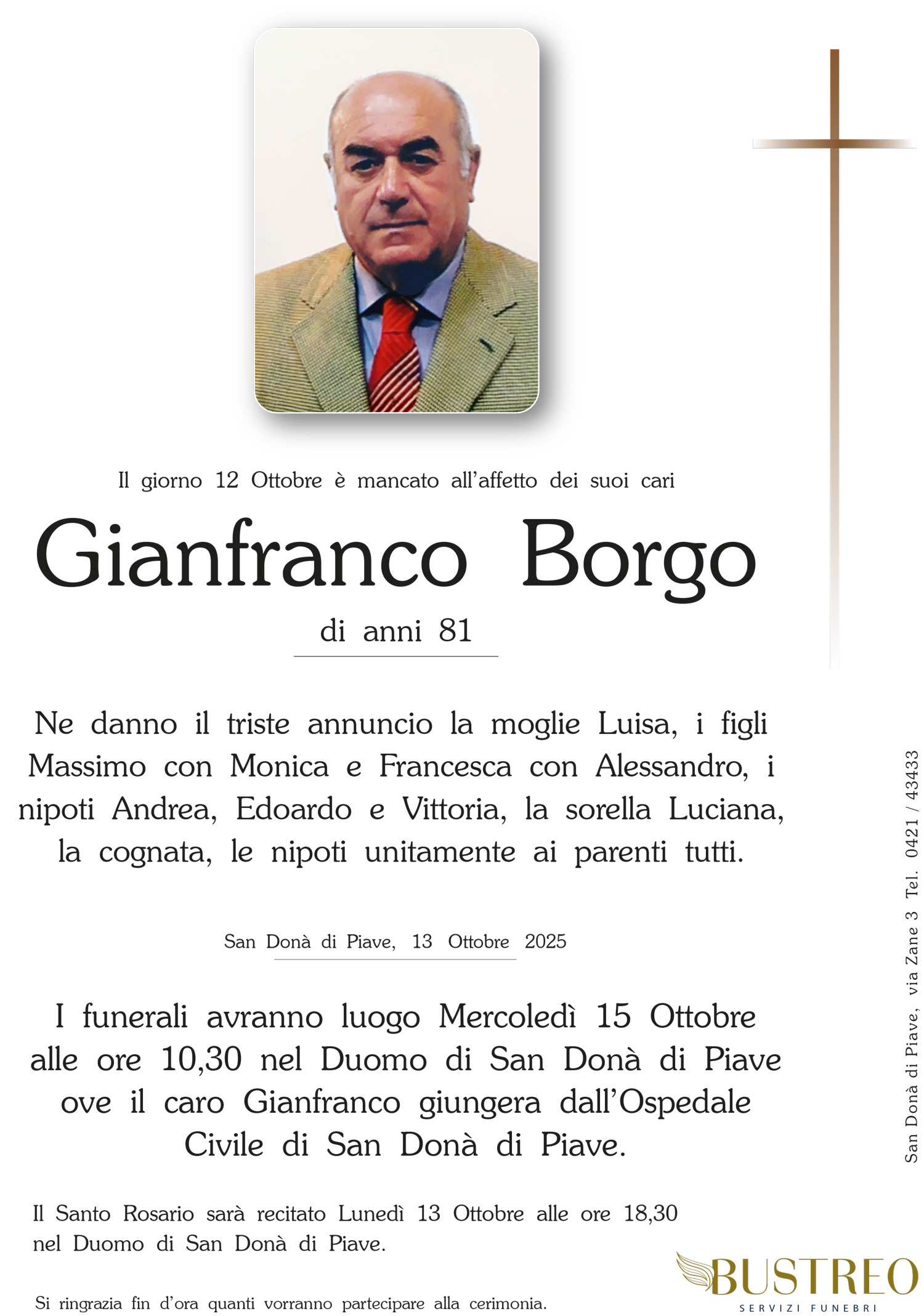 Possa il vostro dolore trovare conforto nel sostegno del Signore e nella certezza che vostro padre è sempre vicino a voi. Il calore della nostra amicizia riscaldi i vostri cuori.